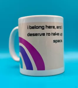 White ceramic mug with rainbow and affirmation – ‘I belong here, and I deserve to take up space’