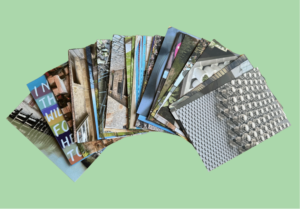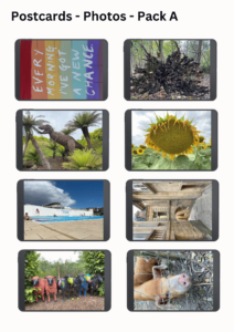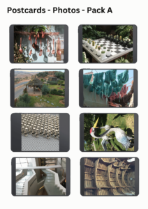 One side is a picture and the other has space to write a message, address and add a stamp. The pictures are varied and are designed to stimulate thoughts, ideas and use of metaphor.