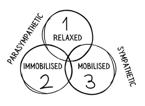 You can think of your nervous system as having three main gears or states. In states 1 and 2 you are in the parasympathetic nervous system, in state 3 you are in the sympathetic. You can be between states as well as fully in one (hence the overlapping circles in the diagram).